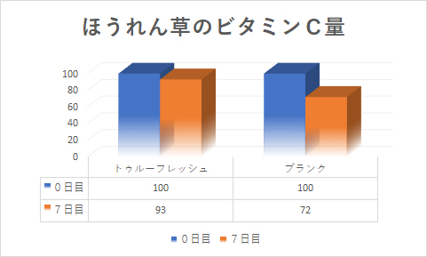 ブランクの袋はビタミンCが72%まで落ちているがトゥルーフレッシュは一週間たっても栄養素量を維持している。