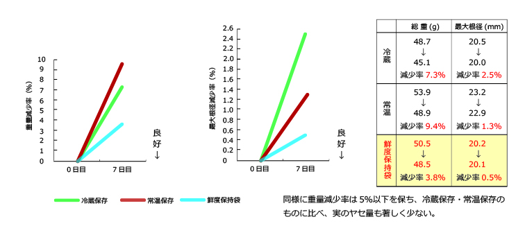 明治大学農学部との共同研究で、同条件において鮮度保持袋を使用した方が重さが減りませんでした。