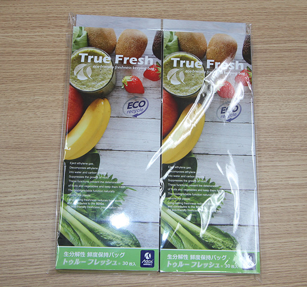 ![]() 畳んだトゥルーフレッシュを台紙に挟んでOPP袋に梱包。 お望みのサイズや枚数で、店頭小売やノベルティにも最適。 |