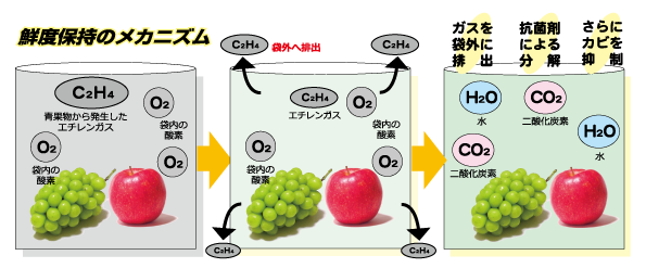 | 特許技術 | ![]() 特許技術 エチレンガス分解排出 野菜や果物自らが成長するために放出する劣化促進物質・エチレンガスと、酸化の原因となる袋内の酸素を、不活性ガスである二酸化炭素とみずみずしさを保つ水に分解します。 また袋外にエチレンガスを排出する機能も持ちます。 さらに抗菌剤の作用による防カビ性能で、青果物の劣化を抑制し鮮度を保ちます。 |